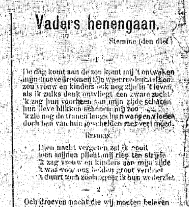 Nog een tekst op een liedblad van René Vangeersdaele, wellicht ook de auteur. Hij leende de melodie van “Een dief uit vaderplicht” om afwisselend de vader-soldaat en de achtergebleven familie aan het woord te laten. Ook de zanger komt eventjes tussenbeide om alles te duiden, maar de toehoorders – zeker zij die pas zelf de Groote Oorlog overleefd hadden – begrepen maar al te goed waar het over ging.